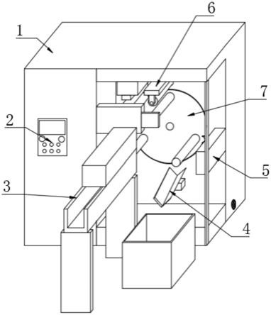 5.為實現上述目的,本實用新型提供如下技術方案:一種小卷複卷紙機加裝升級自動換卷裝置,包括複卷紙機,所述複卷紙機的前側壁體左側設置有控製麵板,所述複卷紙機的前側設置有送料裝置,所述送料裝置的右側設置有下料板,所述複卷紙機的內腔右側固定連接下料裝置,所述複卷紙機的內腔頂部固定連接有下壓裝置,所述複卷紙機的內腔後側設置有自動換卷機構;