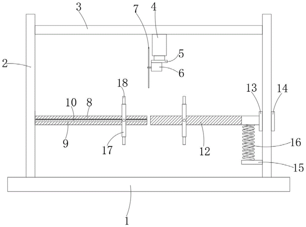 圖中:1底座、2側板、3支撐板、4伸縮氣缸、5安裝板、6馬達電機、7切割刀片、8固定杆、9凹槽、10毫米刻度尺、11滑槽、12活動杆、13限位環、14限位板、15底板、16複位彈簧、17擋板、18把手。
