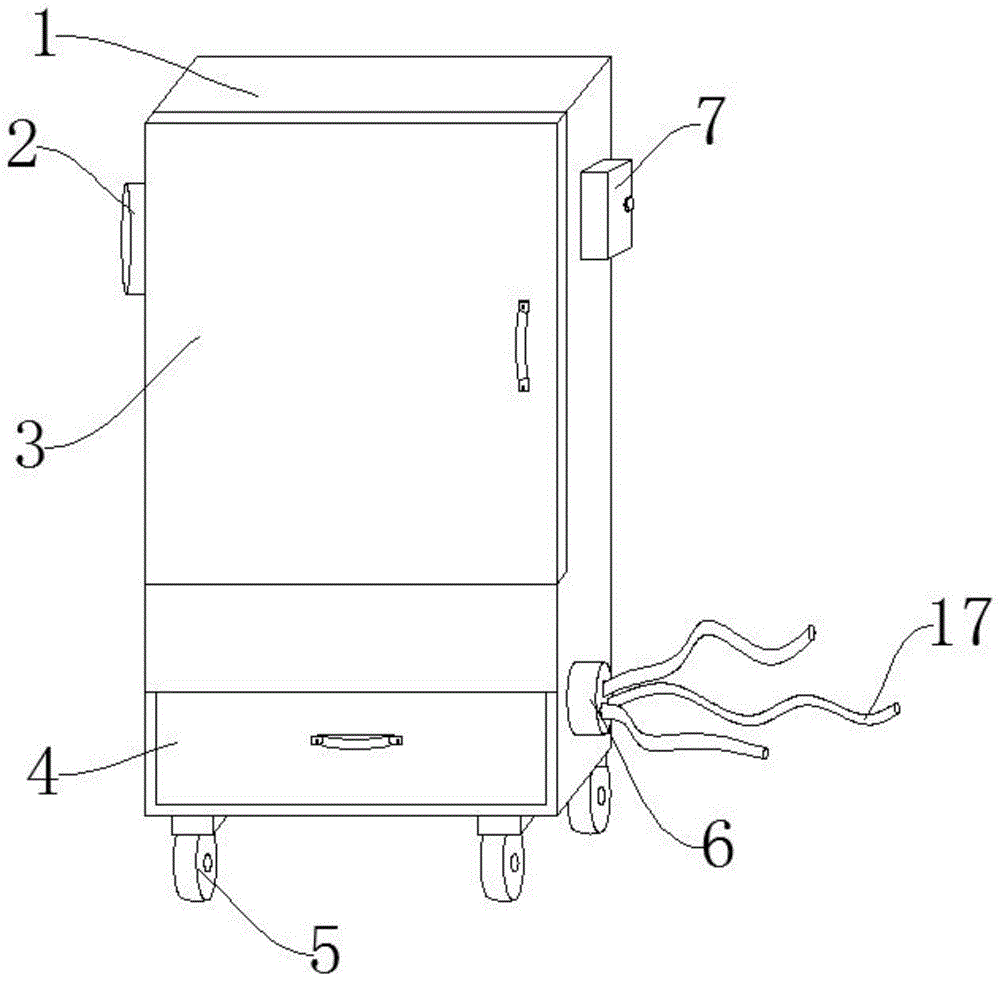 如圖1-圖3所示,一種包裝袋探花网站在线观看除塵裝置,包括箱體1、過濾袋12和吸塵電機8,箱體1底部設置有萬向輪5,箱體1一側壁上通過合頁連接有箱門3,箱門3下方設置有集塵抽屜4,箱體1另一側壁上設置有電控箱7,電控箱7下方設置有吸塵口6,吸塵口6上插接有吸塵管17,箱體1正對電控箱7一側壁上焊接有出風口2,出風口2下方設置有水箱16,水箱16內設置有水泵15,水泵15輸出端設置有水管14,水管14一端設置有噴頭13,箱體1內上端設置有吸塵電機8,吸塵電機8的傳動輸出端設置有葉輪10,吸塵電機8底部設置有支撐板9,葉輪10的下方設置有花板11,花板11下端設置有過濾袋12。